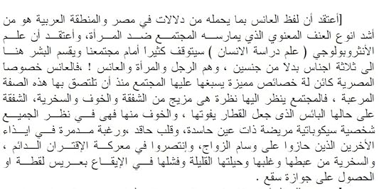 _أفضل ماجاء ف الكتاب ومايمنحه مصداقيته هو تلك الإحصائيات المذكورة بمصدرها وتواريخها وأرقامها التى تقشعر لها الأبدان ،لحوادث ختان أدت إلى الموت،وحوادث اغتصاب أدت إلى الموت أيضا إما بسبب بشاعة الحادثة نفسها ،أو بسبب قتل المجنى عليها تحت مسمى "الشرف" المزيف،والموت ربما يكون أرحم من الآلام النفسية التى تنتج عن هذه الأفعال من خوف ورعشة وأحلام يقظة ونوم مضطرب وكوابيس ،أرقام عن تهميش المرأة وضياع حقها ف العمل،وعن العنوسة ومايحمله المجتمع من ضغينة ضدها.