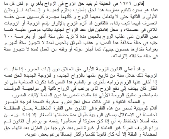 هو المأساة متمثلة فى كام صفحة ! تحدث عن الختان عن فجاعته , قذارته , اسبابه الدونية القذرة تحدث ايضاً عن عمل الفتيات الصغيرات كخادمات , الاساءة إليهن , احتقارهن الكارثة الكبرى زواج الصغيرات - و التى حالياً فى مصر الحضارة لم يجرم و البركة فى حبة الحيوانات اللى عاملين فيها شيوخ القادمين من افكار وهابية متسلطة ما علينا - لم أكن على علم بقانون 79 لتقنين تعدد الزوجات و ابهرنى القانون المرحوم الذى تحدث عن اباحة الطلاق فى حالة الضرر الذى يقع على الزوجات الاولى و الثانية اقتباسات اراء محمد عبده و شحرور فى تفسيرهم الدينى لايات التعدد و متى يباح و هكذا كان ثرياً جداً و شجعنى لبدء موضوع بحثى فى ذلك اما عن قوانين الهئ و المئ التى تعامل المذنبين على حسب نوعهم اذا زنيت و انت رجل فأنت شاهد اما الداعرة فهى مدانة و تعاقب بثلاث سنوات و كثير من قوانين الخيار و الفاقوس طبعاً حديثه عن العوانس و النظرة المجتمعية لهن مما جعل هذا الكتاب اعظم قدراّ هو الاضافات التاريخية و الموثقة عن الاضطهاد والعنف حول العالم ضد نوعنا و طبعاً الرؤية الطبية التى يتشارك فيها كل من خالد منتصر و السعداوى تجعل حديثهما أكثر اقناعاً للقارئ الذى قد يحمل اراء مضادة و اخيراً أحب أقول اكثر الالفاظ فى الكتاب عجبتنى " شرف البنت زى عود الكبريت , اما الولد ف ولاعة الكترونية إلا ما لا نهاية " و عجبى !!