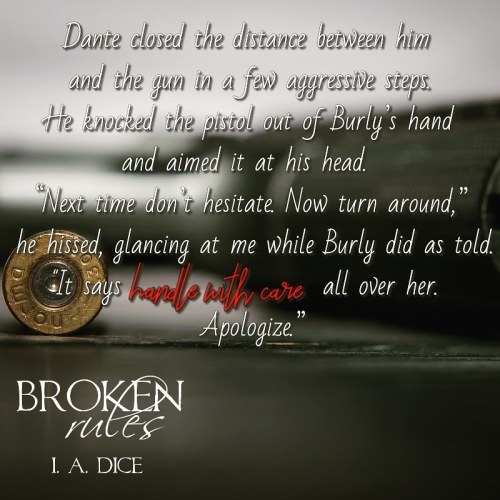 So anyone that follows me knows that right after dark reads, mafia reads are on my favorites list! So when I saw I.A posting about ARC’s for Broken Rules and after seeing only ONE teaser photo and the blurb, I was all over it, SOO glad that I took a chance on this one!