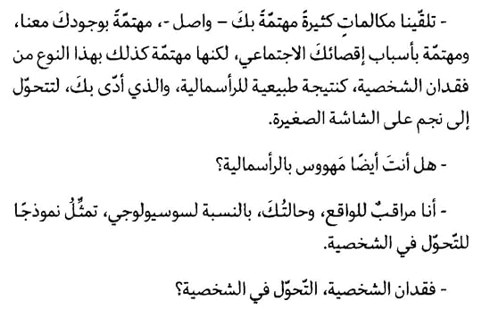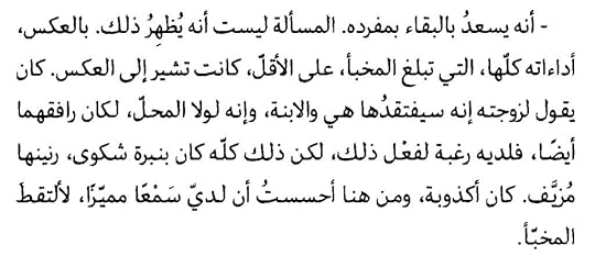 مأخذي على الحوارات، التي وجدتها مبتذلة بين المذيع والبطل (دميان لوبو). ولا بأس بمرور بعض منها هنا وهناك، إذ إنها تعبر عن شخصية البطل وطريقة تفكيره، لكنني وجدتها استحوذت على الرواية، كما أنني لم أجد تقدمًا في الأحداث والتشويق في الأجزاء الأخيرة، وسرعان ما فقدت رغبتي في إكمال الرواية. أكملتها على مضض، لكنني لم أجد فيها ما يميزها، عدا التلصص الذي شدني في البداية.