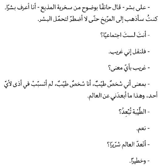 - الرواية فيها خلط بين سارتر وكامو، بطريقة مميزة، بين وجودية وعدمية، وانتظام وعبثية.. فلا تبدأ واحدة الا لتنتهي بالأخرى!! - بإختصار، تجربة ممتعة وانصح الجميع بقرأتها رغم الإختلافات الثقافية التي ستصدم البعض.