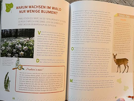 Mir hat das Buch rundum gut gefallen. Ich bin selbst ein absoluter Naturjunkie und auch für mich waren noch viele neue Informationen dabei. Es gibt Ideen für Experimente oder Aktivitäten und kurze "Wald-Infos" zu einem bestimmten Thema. Außerdem ist das Buch wunderschön illustriert und die Kinder können mit kleinen Fragen ihr Wissen testen.