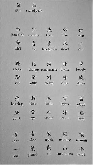 With that in mind, he builds the book around translations of, and short essays on, 19 poems by the poet Tu Fu, who spent much of his life struggling to find a place of peace in security in a China torn by war and rebellions. He provides the Chinese character for each word in the poem, accompanied by a one or two word English translation, often explaining the inadequacy of western vocabulary and grammar. Hinton follows up with solid, poetic translations, but as I read I found myself responding primarily to the characters and single words, building the connections myself, which, if I understand Hinton's essays correctly, is more attuned to the way they were written. (Not that I'm in a position to really critique his approach, but often Hinton comments on how "we"--the western readers--"have to" provide an I that's not there in the original. As often as not, however, I found that adjusting his translation to remove the pronoun worked without creating undue confusion.)