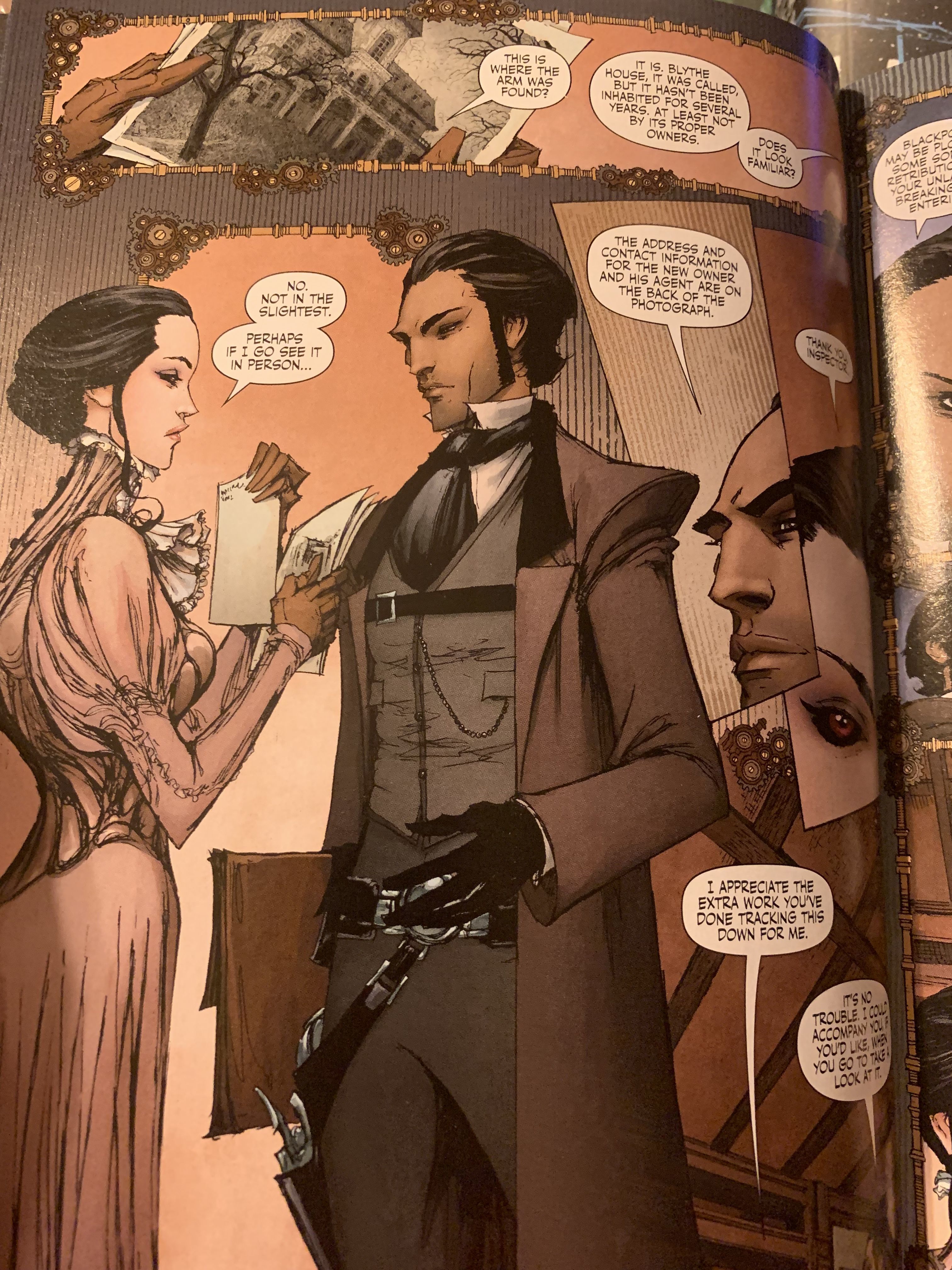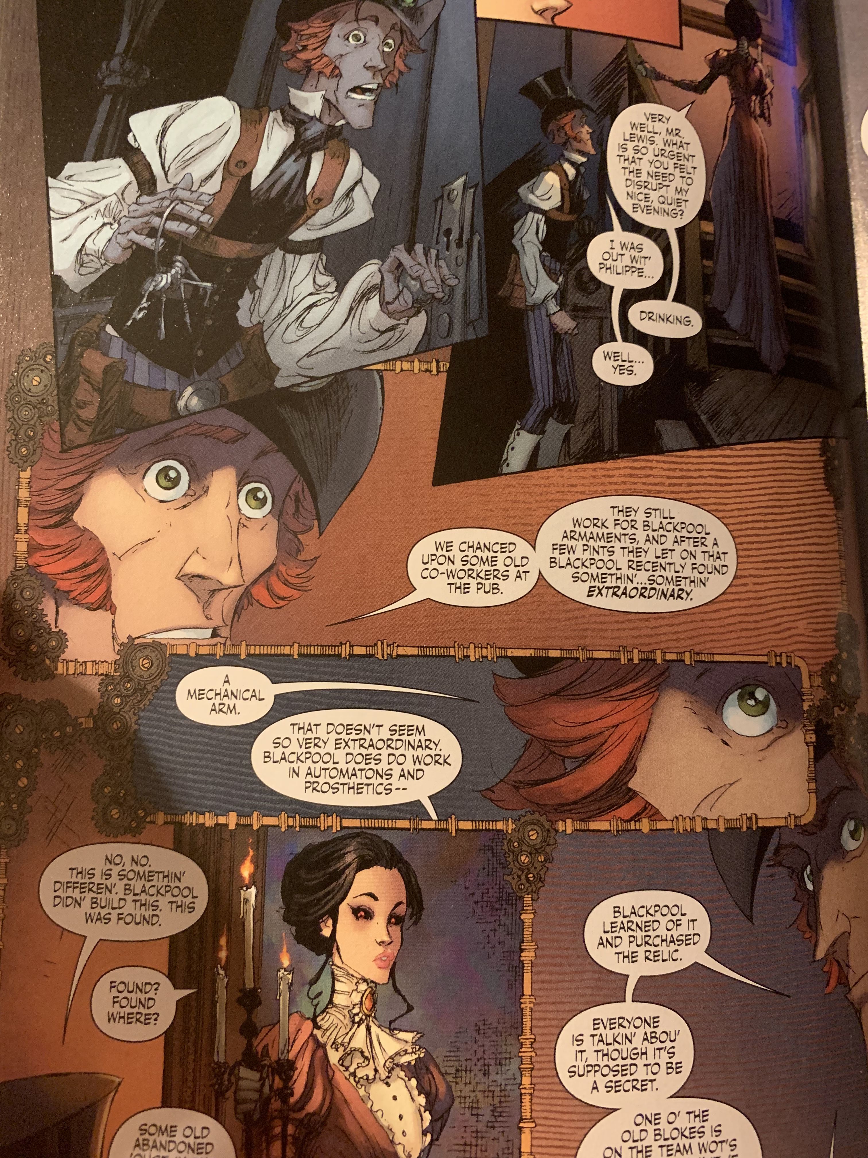 I found myself conflicted by the depression plotline. On the one hand I think the team did a great job of showing that it can take a long time for people who have suffered lost to recover. On the other hand, Lady Mechanika seems to have reached a point where she’s tired of Mr Lewis’s grief and just wants him to go back to being her occasional sidekick. I could actually understand his choice for marriage at the end of the volume and felt that Lady Mechanika took something from him and then left him alone to deal with the fallout at a point when he clearly needs intervention. The idea that he’ll just recover on his own - given enough time - is unfortunately rarely true in real life, and it would have been nice to see this acknowledged in the comic, maybe by sending him to a convalescent home or giving him a pet to care for (it’s possible this will be addressed in the next issue). But that last page with him is very depressing to read.
