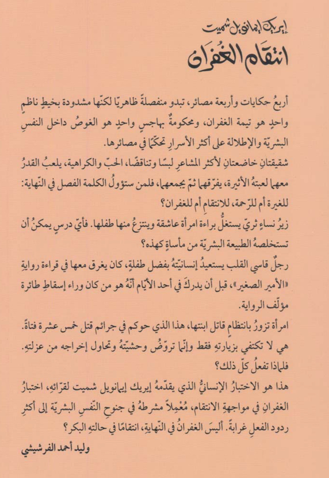 أربعُ حكايات وأربعة مصائر، تبدو منفصلةً ظاهريا لكنها مشدودة بخيطٍ ناظمٍ واحدٍ هو تيمة الغفران، ومحكومةٌ بهاجسٍ واحدٍ هو الغوصُ داخل النفسِ البشريّة والإطلالة على أكثر الأسرارِ تحكّمًا في مصائرها. شقيقتانِ خاضعتانِ لأكثر المشاعر لبسَا وتناقضا، الحب والكراهية، يلعب القدر معها لعبته الأثيرة، يفرّقها ثم يجمعها، فلمن ستؤول الكلمة الفصل في النهاية: للغيرة أم للرّحمة، للانتقام أم للغفران؟ زيرُ نساء ثري يستغل براءة امرأة عاشقة وينتزع منها طفلها. فأيّ درسي يمكنُ أن تستخلصه الطبيعة البشرية من مأساة كهذه؟ رجل قاسي القلب يستعيدُ إنسانيّته بفضل طفلة، كان يغرق معها في قراءة رواية الأمير الصغير»، قبل أن يدرك في أحد الأيام أنه هو من كان وراء إسقاط طائرة مؤلف القراءة. امرأة تزورُ بانتظام قاتل ابنتها، هذا الذي حوكم في جرائم قتل خمس عشرة فتاة. هي لا تكتفي بزيارته فقط وإنما تروّض وحشيّته وتحاول إخراجه من عزلته. فلماذا تفعل كل ذلك؟ هذا هو الاختبار الإنساني الذي يقدمه إيريك إيمانويل شميت لقرائه، اختبار الغفرانِ في مواجهة الانتقام، مُعَمِلاً مشرطة في جنوح النفس البشرية إلى أكثر ردود الفعل غرابة. أليس الغفران في النهاية، انتقامًا في حالته البكر؟