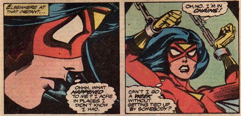 This is what happens when a character is created with no real reason to exist and no central theme. While the equally Copyright-Protecting She-Hulk had the central theme of "what happens when a woman is powered by anger?" to always fall back on no matter how weak her initial stories were, Spider-Woman lacked that concept. Her origin story changed between her first and second appearance, she's a techno-weirdness character infused with magic trained as a spy who gets tangled in macabre menaces until she becomes a bounty hunter and then a PI, while occasionally fighting a 6th century sorceress....
