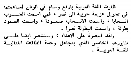 ظفرت اللغة العربية بأرفع وسام في الوطن لمساهمتها في تحويل هزيمة حربية إلى نصر، فهي أسمت الحرب انسحاباً، و اسمت الانسحاب صموداً، و أسمت الصمود بطولةً، و أسمت البطولة نصراً .