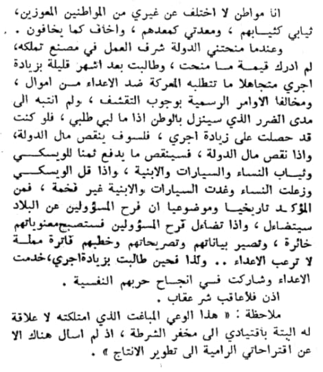 " أنا مواطن لا أختلف عن غيري من المواطنين المعوزين ، ثيابي كثيابهم ، ومعدتي كمعدتهم ، وأخاف كما يخافون … وعندما منحتني الدولة شرف العمل في مصنع تملكه ، وطالبت بعد أشهر قليلة بزيادة أجري متجاهلاً ما تتطلبه المعركة ضد الأعداء من أموال ، ومخالفاً الأوامر الرسمية بوجوب التقشف ، ولم أنتبه إلى مدى الضرر الذي سينزل بالوطن إذا ما لبي طلبي ، فلو كنت قد حصلت على زيادة اجري فسوف ينقص مال الدولة ، وإذا نقص مال الدولة فسينقص ما يدفع ثمناً للويسكي وثياب النساء والسيارات والقصور ، وإذا قل الوسكي وزعلت النساء و غدت السيارات والقصور غير فخمة ، فمن المؤكد تاريخياً وموضوعياً أن فرح المسؤولين عن البلاد سيتضاءل وإذا تضاءل فرح المسؤولين فستصبح معنوياتهم خائرة ، وتصير بياناتهم وتصريحاتهم وخطبهم فاترة ومملة لا ترعب الأعداء … ولذا فحين طالبت بزيادة أجري خدمت الأعداء وشاركت في إنجاح حربهم النفسية ، فلأعاقب شر عقاب ".