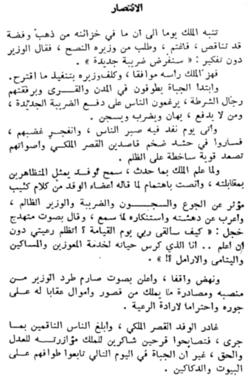 "تنبه الملك يوماً الى أن ما في خزائنه من ذهب وفضة قد تناقص، فاغتم وطلب من وزيره النصح، فقال الوزير دون تفكير: "سنفرض ضريبة جديدة". فهز الملك رأسه موافقاً، وكلف وزيره بتنفيذ ما اقترح. وابتدأ الجباة يطوفون في المدن والقرى وبرفقتهم رجال الشرطة يرغمون الناس على دفع الضريبة الجديدة، ومن لا يدفع، يهان ويضرب ويسجن. وأتى يوم نفد فيه صبر الناس، وانفجر غضبهم، فساروا في حشد ضخم قاصدين القصر الملكي وأصواتهم تصعد قوية ساخطة على الظلم. ولما علم الملك بما حدث، سمح لوفد يمثل المتظاهرين بمقابلته وأنصت باهتمام لما قاله أعضاء الوفد من كلام كئيب مؤثر عن الجوع والسجون والضريبة والوزير الظالم، وأعرب عن دهشته واستنكاره لما سمع، وقال بصوت متهدج خجل: "كيف سألقى ربي يوم القيامة؟ أتظلم رعيتي دون أن أعلم.. أنا الذي كرس حياته لخدمة المعوزين والمساكين واليتامى والأرامل؟!". ونهض واقفاً، وأعلن بصوت صارم طرد الوزير من منصبه ومصادرة ما يملك من قصور وأموال عقاباً له على جوره واحتراماً لإرادة الرعية. غادر الوفد القصر الملكي، وأبلغ الناس الناقمين بما جرى، فتصايحوا فرحين شاكرين للملك مؤازرته للعدل والحق غير أن الجباة في اليوم التالي تابعوا طوافهم على البيوت والدكاكين." ص١٧٤-١٧٥ *قصة "الملك" - شذرة "الإنتصار