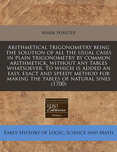 Arithmetical trigonometry being the solution of all the usual cases in plain trigonometry by common arithmetick, without any tables whatsoever. To which is added an easy, exact and speedy method for making the tables of natural sines Forster, Mark. Includes final advertisement leaf. [8], 84, [2], 85-212, [2] p., [1] leaf of plates : London : printed for Richard Mount, at the Postern on Tower-Hill, 1700.where you may have all sorts of mathematical and sea-books, [1700] Wing (2nd ed.) / F1602A English Reproduction of the original in the Bodleian Library