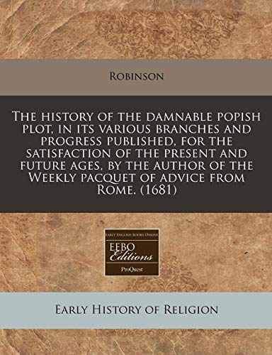 The history of the damnable popish plot, in its various branches and progress published, for the satisfaction of the present and future ages, by the author of the Weekly pacquet of advice from Rome. Care, Henry, 1646-1688. Robinson, 17th cent. [Edition ] The second edition corrected and amended. p. [1] at end. Ascribed to Henry Care and Robinson. Cf. Arber's Term cat., v. 1, p. 524; Halkett & Laing, v. 3, p. 79. [16], 192, 209-343, [1] p. London : Printed for B.R., L.W., H.C., and are to be sold by Langley Curtiss ..., Wing / C523 English Reproduction of the original in the Bodleian Library