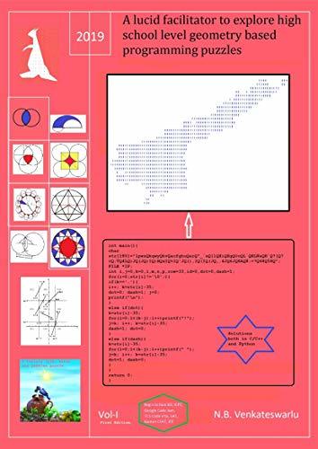 In this book, I have primarily given emphasis on solving elementary coordinate geometry concepts based programming puzzles problems only. I know geometry is the most intuitive area compared to other mathematical themes such as algebra, number theory, calculus at least for the point of view of a high school student. Thus, in order to inculcate problem solving abilities among first level programming students, this book is conceived. Majority of the examples are experimented with my students at GVPCEW, Visakhapatnam and are available at hackerrank for solving I welcome the readers of this book to solve the examples available at this site. This is the first book on geometry based puzzles and thus I consider it as volume I in the proposed geometry based programming puzzles series. I have included many geometry related concepts and theorems along with the solved examples. I advise readers to think of this volume whenever they have any concept related dilemma regarding coordinate geometry. Majority of the exercises that are included in this book needs these concepts and lemmas to solve. The examples included in this book are spread across many varied domains such as computer graphics, image processing, surveying, geography, seismography, board games such as billiards, running tracks, etc. Some puzzles that are related to clipping (selecting something from a whole) are solved with various forms of clipping windows such as circular, rectangular while the objects that are clipped varied from points, lines, circles and polygons. While writing this book, I was at my pinnacle of happiness when I am able to represent a story told by my grandparents to me when I was a kid as a problem here. The story is about a thirsty crow and a pot with very little water which it cannot drink from the brink of the pot. So, it started dropping pebbles to get water to the brisk of the pot for drinking. This story, I have converted into a programming puzzle which certainly I confident that it delights school childrens to solve. Like this, some other examples that are usually told by grandparents are given as programming puzzles in this book. Also, some problems are included to incite students interests on developing scientific domain, robotics and its allied areas and terms such as gripper, movements (degrees of freedom), etc.. Also, some examples demands readers to use image processing concepts such as four neighborhood, edge detection, etc. Simple programming puzzles that demand the use of line equations, intersection points of lines, are included in sufficient number so as to develop curiosity in students in solving programming puzzles. Somewhat reduced version of Billiards game is solved which demands the use of angle between two line segments to decide whether a shot through the cue ball is possible or not. Also, whether a shot becomes fruitful shot is computed by testing whether are there any more balls along the path to a selected pocket. Moreover, some examples such as magic mirror, etc., make the student to use the geometry concepts related to reflection, etc., in solving those problems. Plethora of lemmas related to triangles, rectangles, circles, polygons, 3-D objects, their frustum’s are included in a terse and understandable manner so as to solve programming puzzles involving these things. Many programming puzzles are included that use circles, intersection of circles, circles and polygons, circle surrounded by circles, etc., so as to let the student develop from simple problems to somewhat involved problems. I have implemented all the solved examples in C and Python languages. I know that at school level, C or C++ or Python languages are taught. Thus, I have given solutions in C (such that they runs in C++ also) and Python.