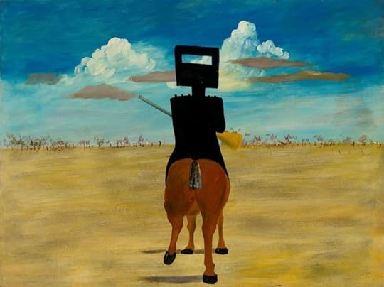 ... a large oil showing a man with a rifle on a skinny horse, posed in a bleak landscape of sand and scrubland with, in the background, a range of distant mountains. But the man had no head. Instead he was wearing a huge square helmet of black metal with a slit for the eyes. Rickards found the picture disturbingly intimidating. He had a faint memory that he had seen a copy of it, or of something very like it, before, and that the artist was Australian. He was irritated to find himself thinking that Adam Dalgliesh would have known what it was and who had painted it - Inspector Rickards examines a painting in the office of Dr. Alex Mair at Larksoken Nuclear Power Station.