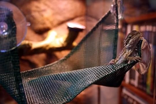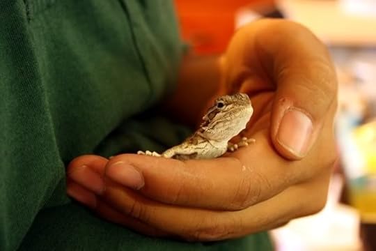 I think I read this book at exactly the right time. I currently have a tiny seven-inch-long bearded dragon* in my bedroom. Since getting her on June 13th, things have changed around here. I get up at 6am whether I like it or not because that's when her lights come on and she wakes up, climbs out of her hammock** and starts looking around for food. I go and put some reptile pellets, vegetables and kale in her feeding dish, give her pieces of vegetables from my hand, take her out, pet her, let her watch the computer screen, put her back in, and then give her either live crickets or dead ones from a can. Oh yes, I have had to face my fear of crickets. I hate crickets so much. Or, I used to. Now I get to put them in the tank and watch my tiny pet predator go after them with the precision of a cheetah on the plains of Africa and it's great. The canned crickets are pretty gross, though. They are all juicy and yucky and dark colored, unlike the light tan crickets from Petsmart.