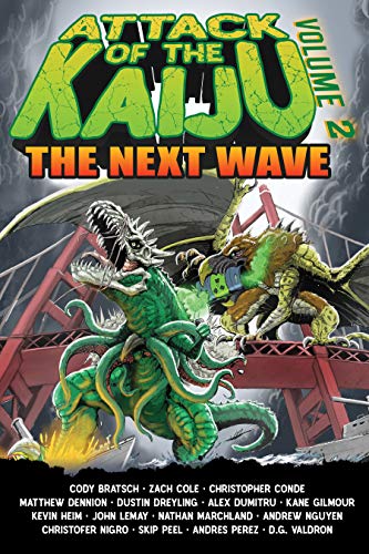 If you ever had nightmares about your entire city being destroyed by gigantic, nigh-indestructible monsters – or daikaiju, as we like to call them in Japanese fashion – then ATTACK OF THE KAIJU Volume 2: THE NEXT WAVE is most definitely for you. Better yet, if you ever fantasized about actually being the kaiju that did the city smashing, then this anthology also has your name on it. Or, if you instead fantasized about being a gigantic super-hero or the pilot of an enormous kaiju-busting robot – well, your dreams will find good representation here too! This second installment in the ongoing ATTACK OF THE KAIJU series has thirteen tales of giant monster mayhem brought to you by fourteen different authors, as well as three bonus essays by additional writers covering the world of kaiju. This includes such prominent kaiju authors as Matthew Dennion (publisher of ATTACK OF THE KAIJU Volume 1: AGE OF MONSTERS and creator of the series); Skip Peel (long-time scribe of kaiju fiction for G-FAN magazine); Zach Cole (creator of Marugrah, whose published saga began with KAIJU EPOCH); and Andres Perez (co-host of the popular KaijuNoir channel on YouTube and creator of the kaiju-fighting mech warrior Draco Azul, now in his own comic book). Also included is the work of Kane Gilmour, John LeMay, Christofer Nigro, D.G. Valdron, Christopher Conde, Alex Dumitru, Neil Reibe, Cody Bratsch, Andrew Nguyen, Nathan Marchland, Kevin Heim, and Dustin Dreyling. Within these pages humanity desperately tries to fight their way back to the top spot as ruler of the world, but can their paltry military weaponry hope to prevail against the most powerful monsters in the genre of fantastic fiction? And where common soldiers may come up short, could super-heroic sentai and robotic mechs – both of whom can match the kaiju in size and power – possibly help turn the tide in favor of human civilization? Can even the gods themselves help preserve humanity’s reign, or are the titanic predators destined to transform their respective Earths into a kaiju kingdom? The answers to these questions will be found in this very tome, so read if you dare! A lot of great excitement and horrifying nightmares await you inside.