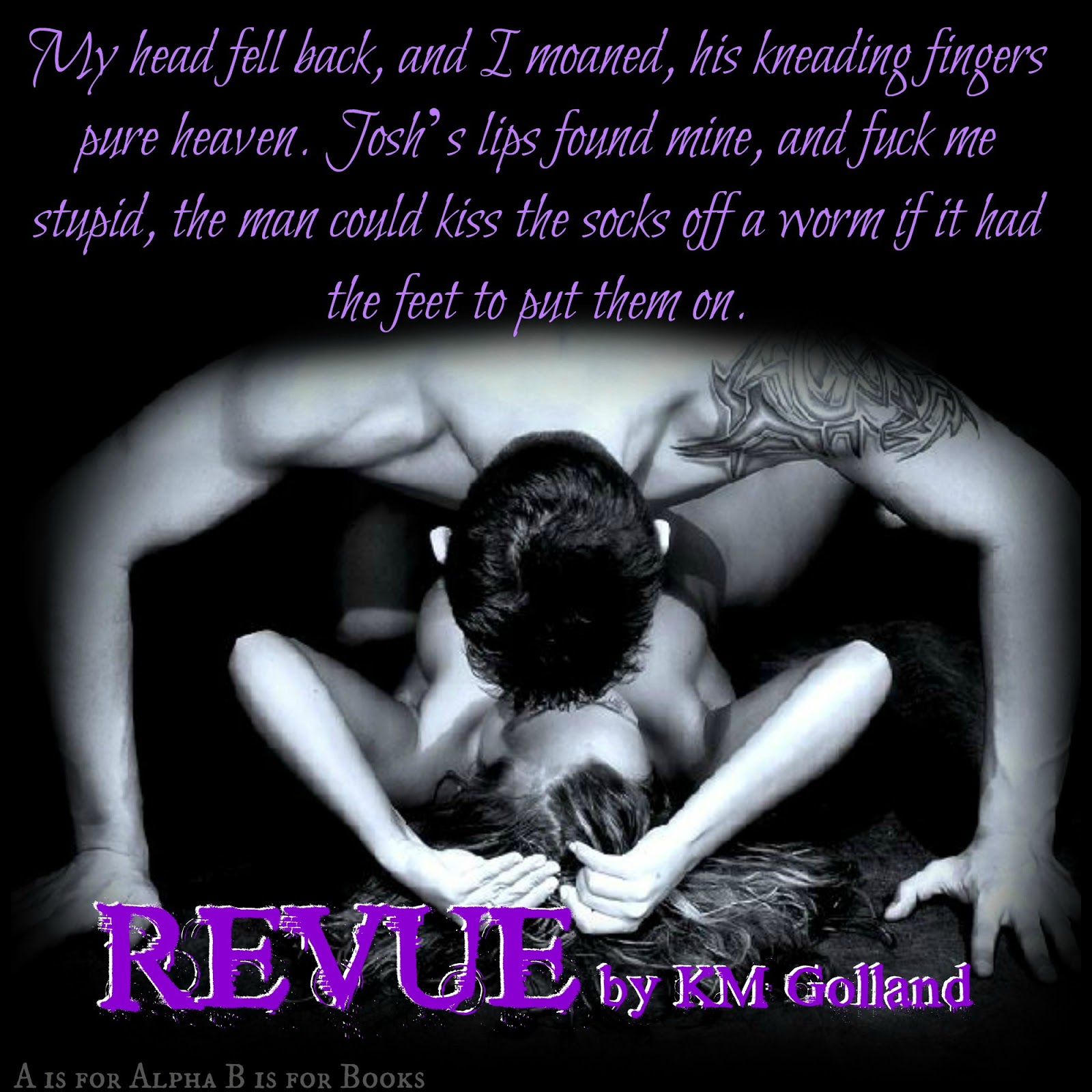 Review by Lisa Kane Having read almost everything KM Golland has written, I am more than familiar with her often snarky, witty, clever style. But in Revue she has kicked this up a notch with her character, Josh Adams. He is the star performer for Wild Nights Revue, a male revue show. This guy brings new meaning to bag them and leave them hanging for more. In fact, our heroine, Corinne's first view of him is his intense screwing of one of his groupie up against a vending machine. (Not sure if they made a selection for any of the treats in the machine) And when our hero is finished, he eyes up Corinne and asks her, >"Want to ride my cock like this bitch just did?" (he's one suave guy isn't he?)