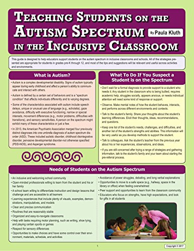 In this six-page, quick-reference laminated guide, author Paula Kluth presents simple, effective strategies for supporting students on the autism spectrum in inclusive pre-K through 12th grade classrooms, and helping all learners succeed. Teachers will find up to date information about the diagnosis of autism, as well as guidance on what to do if you suspect a student is on the autism spectrum, and a list of needs of students on the autism spectrum. In addition, it recommends specific strategies for the addressing/incorporating student fascinations and passions; helping students cope with change and transitions; building a supportive classroom community; creating a comfortable classroom; supporting students who resist doing classwork; creating appropriate assessments; creating accessible whole-class discussions and lectures; teaching literacy and math to students on the spectrum; helping students manage homework; preventing behavior struggles. In addition to being a valuable classroom resource for teachers, aides and support professionals, this concise yet comprehensive guide is also a perfect tool for pre-service or in-service professional development. Parents will also benefit from the strategies outlined in the guide.
