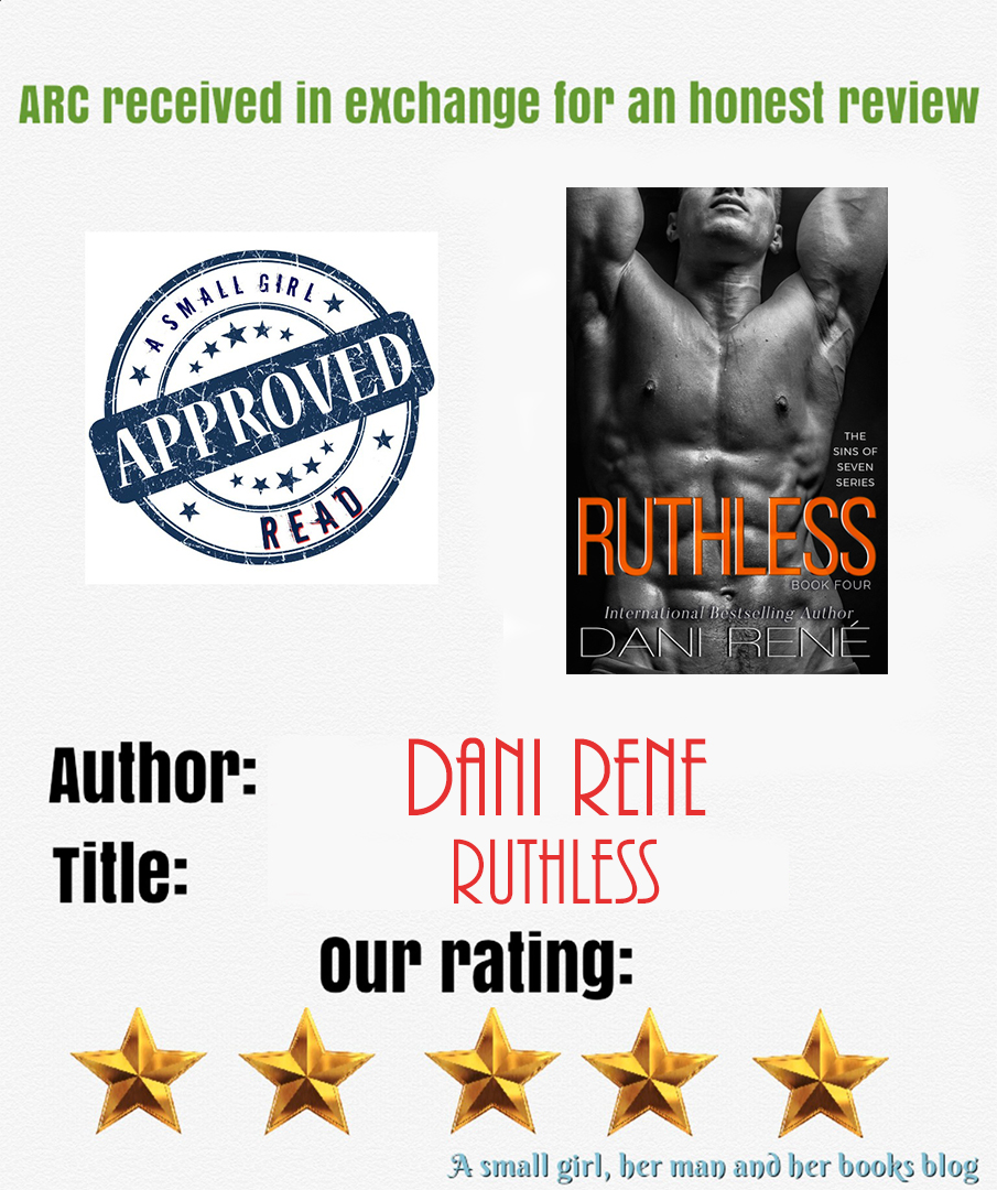 Ruthless by Dani René is book Four in the Sins of Seven series. This is the story of Madison and Callan. I have read the other books but feel you can make this a standalone book. Callan is a hard, rough man who was groomed at a early age to kill or be killed. Although the has a sister and a brother that he does care about that is the only attachments he allows. Women are just for physical release of his dark pleasure. Madison father is rich and high up politician but her life wasn't easy her mother never cared and died when she was younger. Her father didn't connect with her and had her on the fast track to just doing women things and marring a man she didn't want to. The only real thing she was doing was going to a motorcycle BDSM club where she meets Callan. Madison knows he is a dangerous man but that only draws her to him more. This was two hurt, broken, people who had dark desires coming together and it made them whole. Really enjoyed their story.