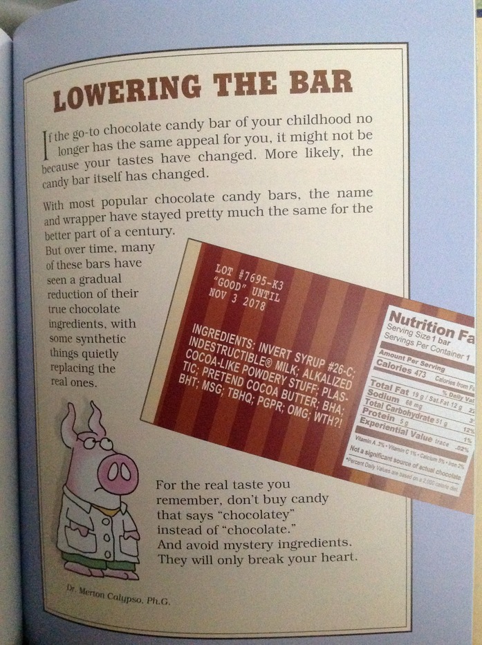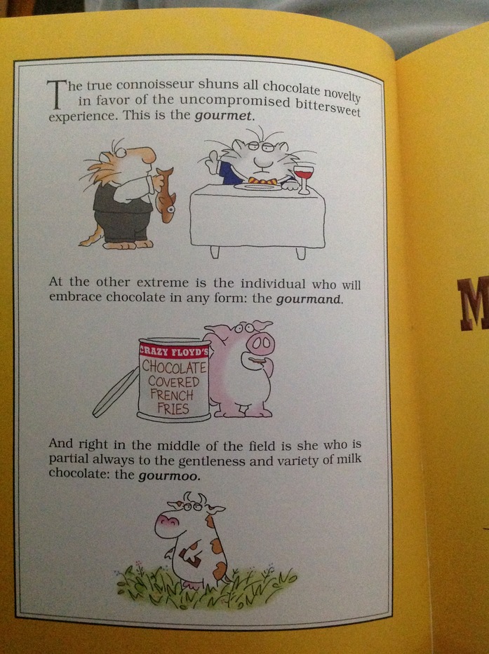 So why did I decide to take on this difficult project [i.e. writing the book]? It was probably for a lot of noble and idealistic reasons. It certainly wasn't that I was somehow luted by the giddy prospect of being able to cliam all of my chocolate-related expenditures as actual business expenses. Oh, wait. Yes it was. [inside back cover]