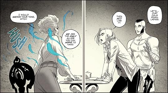 I could give a regular review going over the characters, art, pacing, etc. but there are many other reviewers that can do that for this book and better. Instead, this review is to get my opinions out and the thoughts on elements of the book I feel like reviewer's do not mention or are seen less in the review section. I absolutely the world building! It is explained a bit more in afterword but essentially the world is . It honestly makes for an interesting story about identity and the power other's perspectives have on us as individuals. Now for the story itself I love it! The first two issues are confusing with little explanation of what is going on but by the end of the volume the world and what is going on made sense. The art is also beautiful! Not only is the art beautiful but so is the art direction. The main character has a sight condition where she sees in black and white. This makes it so that everything in the "mundane" world is colorless. But she is secretly a witch and can see "magic" in color meaning you get this great contrast of a monochrome world with splashes of color. TBH . The "mundane" world is also left with more traditional composition with more simple layouts. But in her dreams or when magic is involved color splashes all over the page. And the composition becomes more experimental as well which leads to great visual storytelling. I also like how her dreams get a unique art-style look by being drawn lineness. Also, Nomen Omen is the epitomy of bi panic. All of the characters are hot.