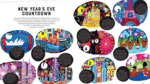 Celebrations span across the globe and religious/secular spectrum. Learn about Ramadan and the Day of the Dead and St Patrick's Day, but also learn about Walpurgis Night, La Tomatina, Désalpe, and Pongal! Entries for Pride Month, Earth Day, and Food Festivals are lovely and welcome. A few pages, like New Year's Eve Countdown, highlight more than one cultural celebration at a time.