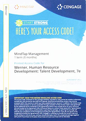 MindTap Management for Werner's Human Resource Talent Development, 7th Edition helps you learn on your terms. INSTANT ACCESS IN YOUR POCKET. Take advantage of the MindTap Mobile App. Read or listen to the text and study with the aid of instructor notifications, flashcards, and practice quizzes. MINDTAP HELPS YOU GEAR UP FOR ULTIMATE SUCCESS. Track your scores and stay motivated toward goals. Whether you have more work to do or are ahead of the curve, you'll know where to focus efforts. You stay engaged with real-world assignments related to companies like Microsoft, UPS, and Adobe. You also examine topics like gaming in education. MINDTAP HELPS YOU MAKE THE TEXTBOOK YOURS. No one knows what works for you better than you. Highlight key text, add notes, and create custom flashcards. When it's time to study, gather everything you've flagged into a guide you organize.