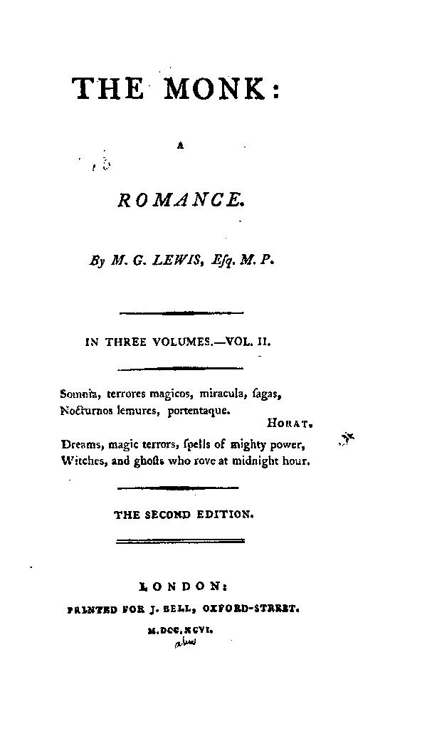 Matthew Gregory Lewis was an English novelist and dramatist, often referred to as "Monk" Lewis, because of the success of his classic Gothic novel, The Monk.