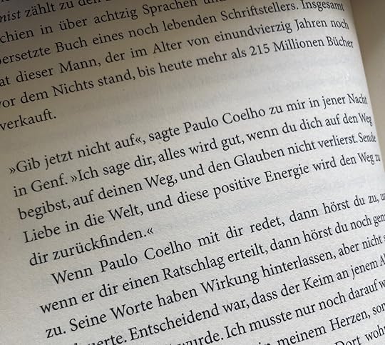 Ich war recht schnell abgenervt von dem scheinbar unzusammenhängenden Hin- und Herspringen. Mir hat ein roter Faden gefehlt und ich hatte bei knapp 60% des Buches keine Lust mehr auf Sinnieren vor der Espressomaschine, den "rasch dahingekritzelten" Gedanken und Sinnfragen. Vielleicht ist das Buch dafür gedacht, pro Tag ein Kapitel zu lesen? Und was mich massiv gestört hat, war das name dropping. Schön für den Autoren, dass Rudolf Schenker sein guter Kumpel ist und Paolo Coelho ihm persönlich gute und wertvolle Ratschläge gibt. Ich freue mich, dass er solch inspirierende Freunde/Bekannte hat, wirklich. Aber immer wieder von Rudolf Schenker zu lesen - sorry, aber: gähn.