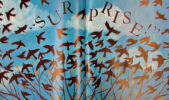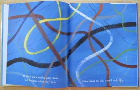 My favorite part of the story: "If birds made marks with their tail feathers when they flew, think what the sky would look like." "If there are lots of birds in one tree and they all fly away at the same time, it looks like the tree yelled, SURPRISE!" "I like to pretend I'm a bird. I can't REALLY fly, but I can do this… I can sing!"