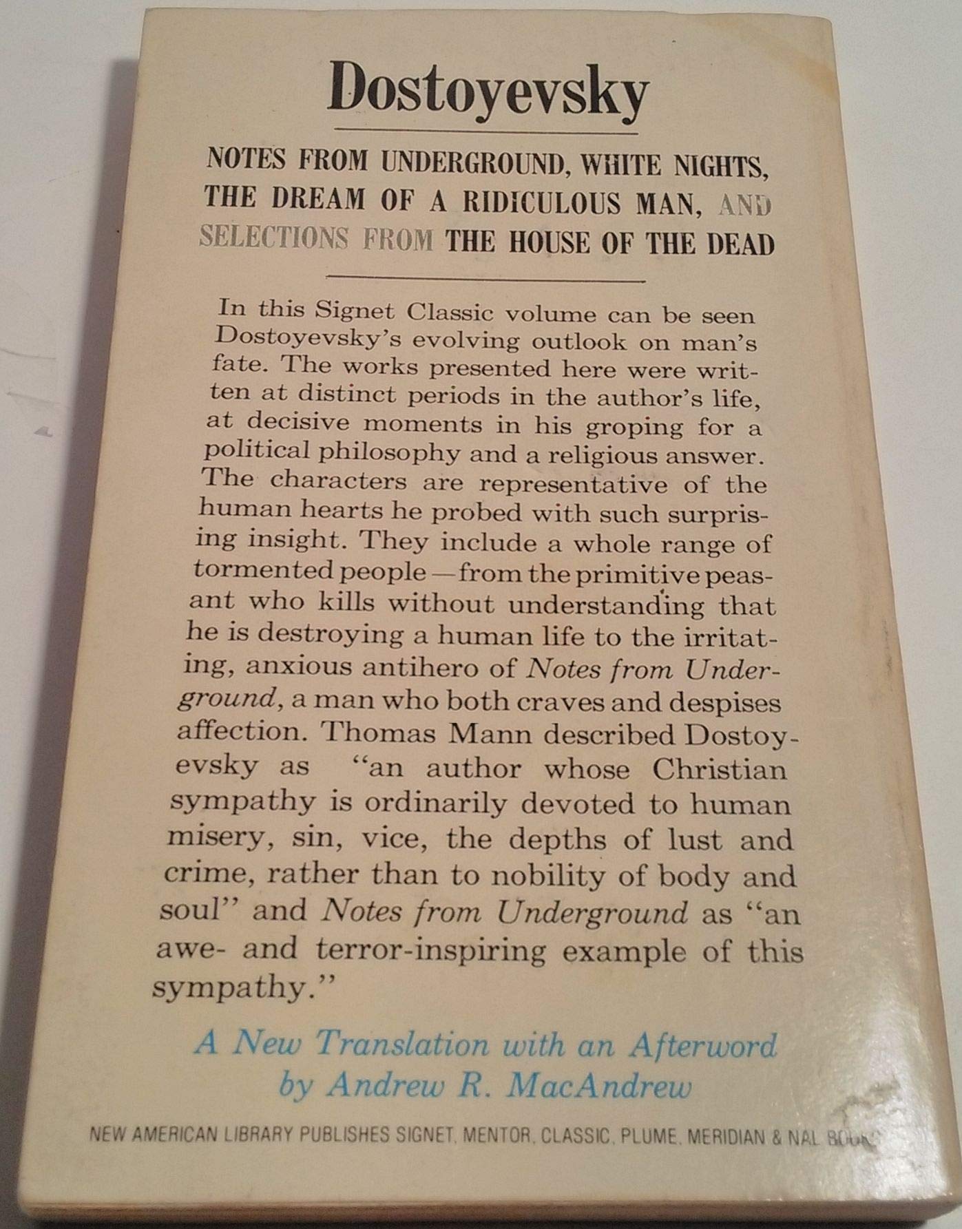 The more I read Dostoyevsky the more I am convinced that nobody on earth understood human nature and the labyrinth that a human mind is more than he did. Kafka said a book should be the axe for the frozen sea within us..Well Dostoyevsky's insight is a chainsaw, a bulldozer, an excavator at the same time. Like I always say, if somebody patiently reads his work he cannot, cannot NOT contemplate about life and its rather acrid ways. It takes a lot to open up and expose the most gloomy terrains of ones heart. It takes courage to admit what most of us hide behind. The question is, does it serve any purpose? Of course it does. Once learned and acknowledged how much of it you yourself are guilty of, you start the healing process within, a rehab that must begin with realization. And that is what Dostoyevsky does, not in just Notes, but through out his body of work.