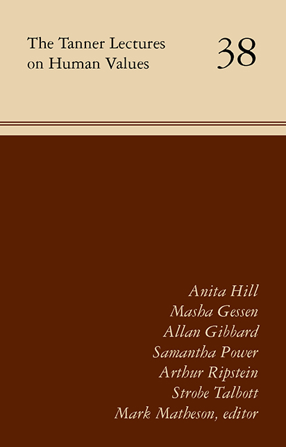The Tanner Lectures on Human Values, founded July 1, 1978, at Clare Hall, Cambridge University, were established by the American scholar, industrialist, and philanthropist Obert Clark Tanner. Lectureships are awarded to outstanding scholars or leaders in broadly defined fields of human values and transcend ethnic, national, religious, or ideological distinctions. Volume 38 features lectures given during the academic year 2018–2019 at the University of Oxford, Stanford University, the University of Michigan, the University of Utah, and Harvard University. Anita Hill , Professor of Social Policy, Law, and Women's, Gender, and Sexuality Studies, Brandeis University “From Social Movement to Social Ending Sexual Harassment” Masha Gessen , Journalist, The New Yorker Lecture “How We Think about Migration” Lecture “Some Ideas for Talking about Migration” Allan Gibbard , Professor Emeritus, Department of Philosophy, University of Michigan, Ann Arbor “The Intrinsic Reward of a Life” Samantha Power , United States Ambassador to the United Nations, 2013–2017 Lecture “Lessons for Dark Times” Lecture “Diplomacy after Darkness” Arthur Ripstein , Professor of Law and Philosophy, University of Toronto Lecture “Rules For Wrongdoers” Lecture “Combatants And Civilians” Strobe Talbott , Foreign Policy Analyst, Brookings Institution “A President for Dark The Age of Reason Meets the Age of Trump”