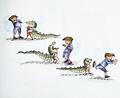 A little boy doesn't want to be a little boy anymore, so an auntie sends him an alligator tail. Mother is worried and calls the doctor, then the vet, but the vet says he just needs to go to school. Darling story of a little boy with a great imagination.