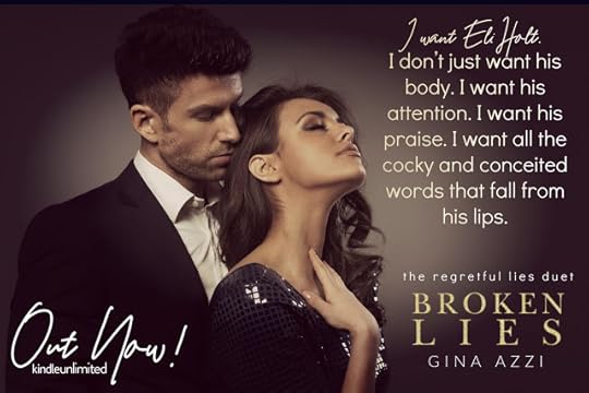 Azzi had me turning page after page and I had finished the book before I even realized how far I had gotten, Broken Lies was addicting and amazing. Gina Azzi gave us two amazing characters in Eli and zoe and side characters that added everything.