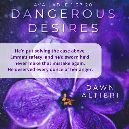Title: Dangerous Desires Series: n/a Stand alone: yes Author: Dawn Altieri Genre: Romantic Suspense Blurb: Three years after Emma Sloane's wealthy fiance's mysterious death, she's finally ready to move on and pursue her own dreams. But her plans are derailed when she's attacked outside her New York City apartment in what she thinks is a random violent incident. Then other women who look just like her start turning up dead...