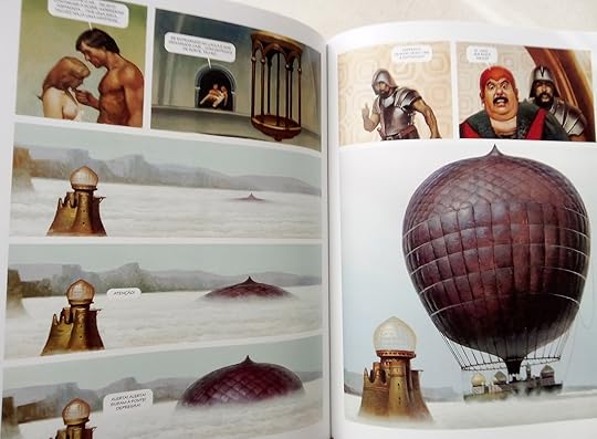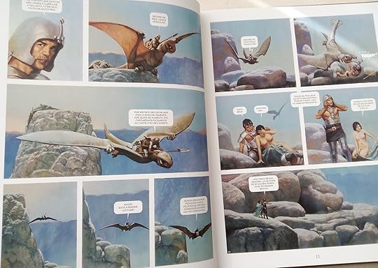 En su momento, cuando apareció en las páginas de Cimoc, nos dejó a todos con la boca abierta. Ese universo de etéreos dragones voladores, sumido en las nubes y en un mar infinito, con esa calidad de pintura (el autor pintaba los cuadros ¡al óleo!) era cautivador. Es cierto que como historieta podía resultar algo estática, como aquellas historias de Harold Foster, pero esas viñetas con un color increíble eran un lujo a la vista. La trama tiene sus altibajos, y en la mayor parte sólo sirve de excusa para que el autor de rienda suelta a su particular imaginario en el que combina también mitos griegos, paisajes árabes, viñetas egipcias... La historia nunca fue lo importante. Muchos años después de la primera vez que lo leí puedo leer completa la saga, gracias al acceso que tenemos hoy en día a la información. Y me he seguido maravillando ante algunas de las viñetas que son, esta vez de verdad, auténticos cuadros.