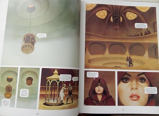 »»» Sentimento final: Espetacular. Fui criada nos anos 80 e no videoclube os filmes tipo fantasia, bárbaros tipo Conan e ficação-científica eram um “must” e estavam por todo o lado. Este livro, não sendo igual a nada que já vi, lembra-me esses fantásticos mundos fantasiosos. A arte fora de série do livro apenas eleva a história, porque nos dá criaturas, personagens, locais e engenhos absolutamente fabulosos. É também um bónus ter um herói masculino, forte e com fibra moral, coisa que lamentavelmente não está na moda nos dias de hoje. Nota final, claramente o autor é um autor do seu tempo, que nos dá bastante nudez feminina, mas até isso adoro, porque não só é feita de forma elegante, como é algo típico neste tipo de histórias, tal como elas resultavam nos anos 80.