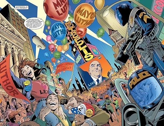 Widać to na splashu zaraz za pierwszą stroną. Jedną trzecią kadru zajmują wyeksponowani policjanci, a w tle można zobaczyć jeszcze sterowiec albo napis „Aliens Out” (Kosmici wypad). A to wszystko w wcale-nie-NY Metropolis, gdy na burmistrza ponownie zostaje wybrany Luthor.