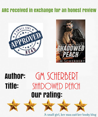 Shadowed Peach by G.M. Scherbert is the eighth book in her Devil's Iron MC Series, and this is probably one of my favorites so far. Following the story of Shadow and Peach, their pasts are a tangled web of hurt and love, yet they can't seem to stay away from each other. The more that they hurt each other the more they are drawn right back into each other's arms. When Peach sees Shadow across the room at The Dungeon, she is almost powerless to resist him. His darkness calls to her, and the heat in his gaze licks the flames inside of her. Shadow knows that he needs to stay away from Peach, they can never do anything more than hurt each other, and yet the haunted look in her eyes is enough to pull him back in every time they are even remotely close to each other. Seeing her at The Dungeon, the atomic pull between them sucks him in and he can't stay away from her. Her eyes have haunted him and yet it is the chemistry between them that keeps his tethered to her completely. The past between these two is allot to overcome, but the leap of faith would be a better fall if they have each other. Scherbert is a relatively new to me author, but after starting this book I went out and bought the rest of this series to power read them all together. This book can be read as a standalone but I highly recommend reading the entire series in order, as many characters make appearances in other books. Also the series was so freak's amazing that it is something that needs to be shared to everyone in its full form. If you are looking for a fantastic MC book with touches of BDSM, enough heat to keep you up at night and a page turner of an author than this is a series you need to buy immediately.