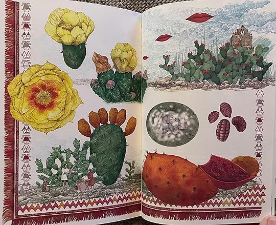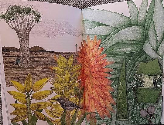 I wasn't blown away by the illustrations, but the information about the plants was mostly really interesting. The most amazing fact - "according to researchers who can tell the age of cacti many saguaros" - the kind of cactus you imagine when you think of cactus - " germinated in 1884. That was the year after the volcanic eruption of Krakatoa in Indonesia, which spewed enough fine dust into the atmosphere to alter rainfall patterns. The Sonoran Desert became temporarily wet enough to give saguaro seeds an extra chance." WILD!