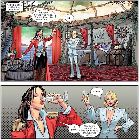 Wow, qué horrible final, la verdad no lo vi venir, espero desde luego pronto los siguientes números. Bueno creo que ha sido muy buena idea juntar a Kitty Pryde (Kate a partir de ahora) y a Emma Frost. Ésta que está a cargo del Hellfire Club como Reina Blanca comparte con el temible Sebastian Shaw (el rey Negro) y consigue un cupo vacante para el Rey Rojo que es propuesto a Kate. La relación de ambas ha sido y es compleja y aunque suene bastante disparatado el cómic creo que su dinámica es lo que más me ha gustado. En efecto vemos a Kate convertida en una pirata a bordo de un barco multipropósito y formando un grupo llamado Marauders al cual reclutará a Storm (quien no está a gusto por estar en algo organizado por Emma), Icema, Pyro y Bishop. Claro, ellos se unen más por cariño a Kate que por compartir sus planes. Sin embargo Kate tuvo esta decisión a raíz de no ser aceptada por Krakoa el nuevo hogar de los mutantes quien por razones extrañas no la acepta en su isla. Su objetivo es reclutar a los mutantes que no pueden llegar a Krakoa paseando en su gran barco.