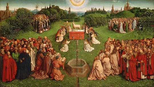 Detail of the main panel of the Ghent Altarpiece with the worship of the central Sacred Lamb. Image sourced from Wikipedia.