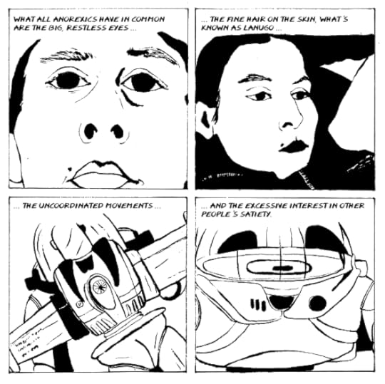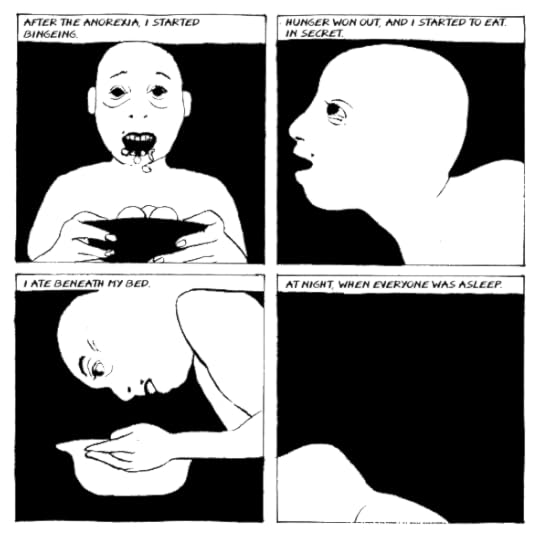 Very visceral and provides straight forward depiction about the author's eating disorder. She does not hold back. The narrative/story as a whole moves as a "stream of consciousness" rather than a more structured organization. A bit abstract at times with the author's drawing portraying her story.