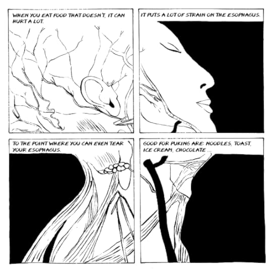 She writes about eating disorders in a way that is honest, with a drawing style that basically reflects the crude nature of something so raw as trying to expel your stomach contents from your body. The narrative is a bit... non-narrative, if that makes sense; it's more stream-of-conscious-y, recounting memories of her eating disorders, going to art school, and problems with her father. If this were a painting, it would be abstract or surreal; sometimes the drawings are obvious and sometimes they are not. Like, literally- some of them I really don't know what they mean, or I can only guess.