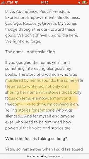 The author chose the pen name Anastasia King because she claimed she wanted to empower women and speak for someone who was otherwise silenced?? The real Anastasia King was a mail-order bride strangled by one of her tenants whiles her husband pinned her down and then buried her in a shallow grave. All you have to do is google her name, and several articles about it will pop up. Now, explain how a dark romance with a woman who is repeatedly abused and sexually assaulted by men(and she enjoys it) honors her--not to mention the number of times these men choke her. The author has changed her website biography several times—I assume because she realized how tactless it was to profit off this woman’s name. But rather than admit any fault in what she did, she continues to twist the narrative and lie about it. Now it says that Anastasia King sounds like a 'porn star's alias'...so that's unbelievably disrespectful. -- The Sunderlands is a perfect example of why it’s essential to ensure your beta-readers and editors are unbiased and not your best friends. This book looks like an editor has never even touched it though the author claims a ‘team of editors’ have gone over it dozens of times. I see no evidence of that. The book is overflowing with fragments; the author doesn’t seem to understand how to use proper punctuation or even an Oxford comma. There are hyphenated words that should not be, and many typos and grammatical errors. There are so many anachronisms that I could probably write my own book about them. The author writes solely in fragments or overly purple prose, making the narrative difficult to follow. Words like ‘Man’, ‘Human’, and ‘Sun’ are turned into proper nouns for no conceivable reason.