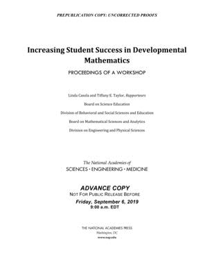The Board on Science Education and the Board on Mathematical Sciences and Analytics of the National Academies of Sciences, Engineering, and Medicine convened the Workshop on Increasing Student Success in Developmental Mathematics on March 18-19, 2019. The Workshop explored how to best support all students in postsecondary mathematics, with particular attention to students who are unsuccessful in developmental mathematics and with an eye toward issues of access to promising reforms and equitable learning environments.