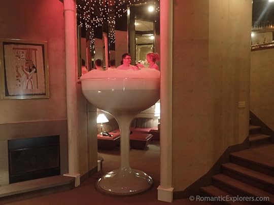 The old my car won’t start gets the ball rolling, and the hero finally gets to consummate things with the heroine at the place of my teen dreams. The Poconos. Yep, the H takes her to the oh-so classy Champagne suite. Neither the heroine nor I ever figured out if he was serious or not about how sexy the Champagne suite was, but it was a mark up over the El-Car Motel. Sadly their bed was round and not heart-shaped, but at least there was a mirror on the ceiling and a champagne glass to roll around in.