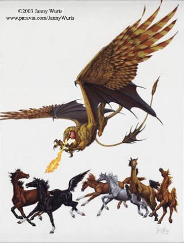 And here is where this little story begins, with a so called dimwitted scullion who cannot stand any animal's pain, a magnificent but killer horse full of hatred and a choice that both of them will have to make, to save Silverdow's gold. Other great horses by Janny Wurts in To Ride Hell's Chasm