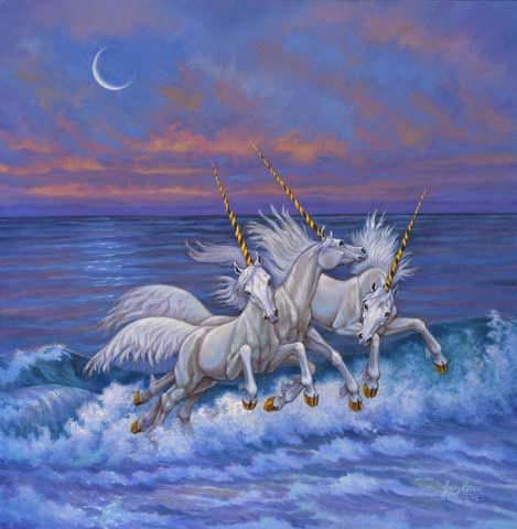 A good deed on a stormy shore provides a young girl with the opportunity to discover herself and may be, just may be, the chance of doing more than just stringing the looms in her father's craft shop for the rest of her life. "MoonlightFrolic" by Janny Wurts I didn't find horses in the water, but found some unicorns instead. :)