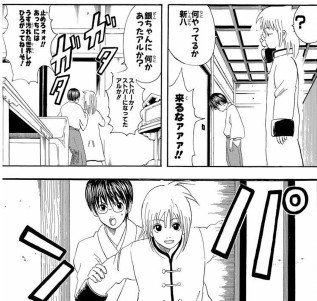 Favorite random panel: Kagura in her pjs and bedhead rushing in to wake up Gin-chan, with Shinpachi trying to stop her (because Gin-chan is currently covered in Sacchan) and they look so much like siblings!