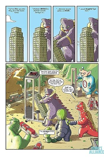 There's so many concepts here that just made me straight out laugh. But there's also this weird juxtapose, because Zander Cannon takes this shit seriously. It gets incredibly dark in places, like kaiju on kaiju rape dark. The artwork is not as defined as I've seen from Cannon in the past. He's opted for a simpler, cartoonier style in the book, full of bright colors.